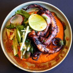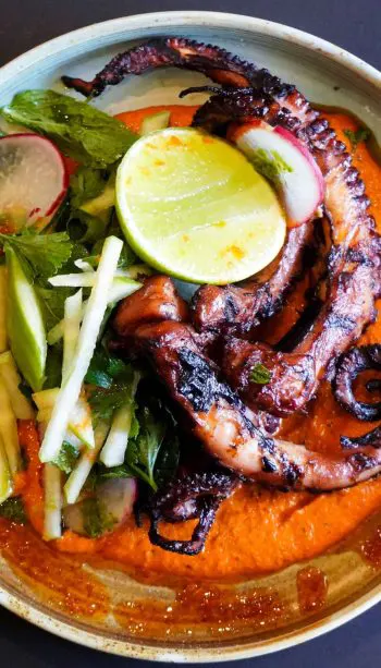 GRILLED OCTOPUS (GFO) Romesco, herb leaf and apple salad tossed in portugese spice and herb oil