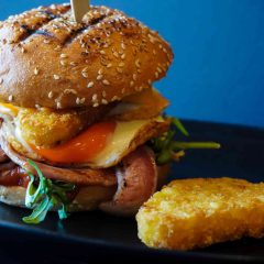 Brioche, bacon, egg, tasty cheese, tomato relish & hash brown